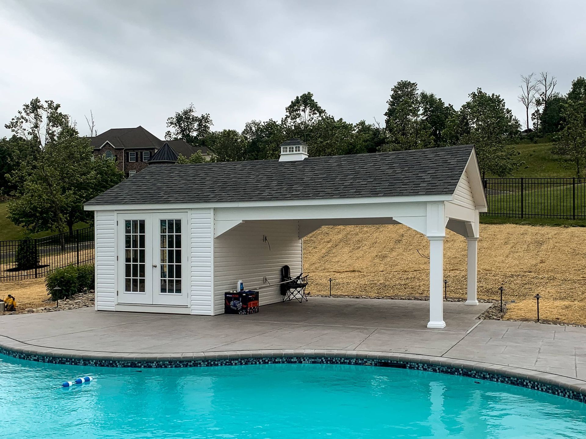 From fully enclosed poolhouse cabanas, to open & ornate gazebos; there are a range of options to choose from when it comes to outdoor structures. For pool cabanas, you have the option to add on a pergola or pavilion, or even add a screen to create a screened-in lounge area.