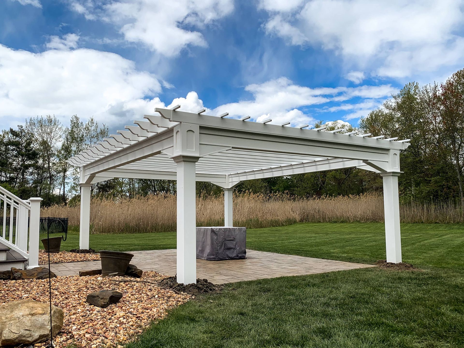 Get the traditional pergola look without the maintenance of wood. Made from #1 grade treated southern yellow pine and covered in high-quality vinyl, our vinyl pergolas offer a worry-free addition to your backyard.